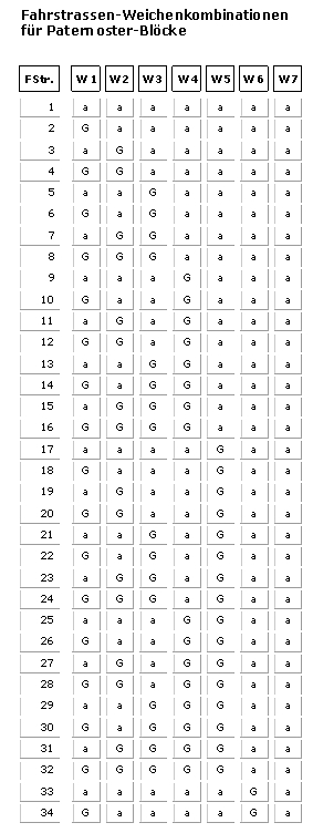 Fahrstraßen-Tabelle für die ersten 34 Fahrstraßen-Definitionen.