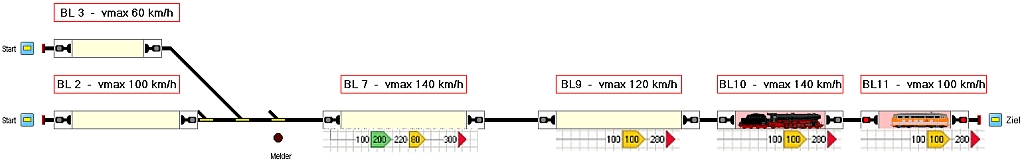 Wenn der Zug vollständig in Block 10 angekommen ist, beschleunigt er auf die dort zulässig vmax. von 140 km/h. Nach Passieren des orangenen Bremspunktes vermindert er seine Geschwindigkeit auf die vmax. des Blockes 11, also auf 100 km/h, um bei Erreichen von Block 11 die dort zulässige vmax. zu fahren.